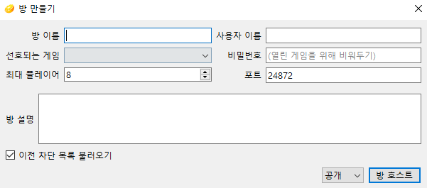 4-1. 방 만들기를 클릭하면 이런 창이 뜹니다. 친구들끼리만 하려면 비밀번호를 설정하시면 됩니다.